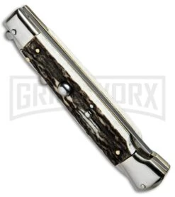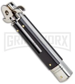 This Leverlock model features a damascus dagger blade and a blackwood handle with brass bolsters. These handcrafted automatic knives are just like the fancy Italian leverlocks without the painful price tag! When you press the lever release the action is fast and the lock-up is solid. These have genuine dark wood handle scales with brass bolsters and file work along the spine. Add a great alternative to the Italian made Leverletto to your collection, at a great price.