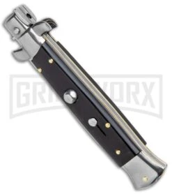 AKC Shot Puller 8″ lever lock knife from Italy. Beautiful workmanship & style. Press the lever down and the knife opens automatically, press again to release and close the blade. This lever lock features real stag horn scales, nickel silver bolsters and a stainless steel drop point blade.