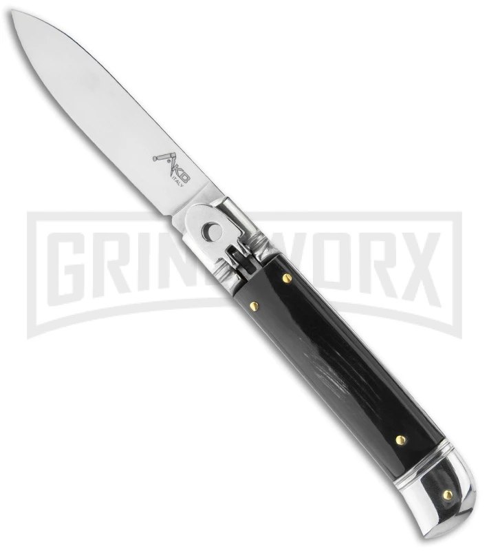 This claiss streamline automatic lever lock from AKC is handmade from Italy. Beautifully handcrafted, it features stainless steel construction, high polished bolsters and real dark horn scales accented with brass rivets. Press the lever down and the knife opens automatically! Tang stamped “AKC”. Beautiful workmanship and flawless design.