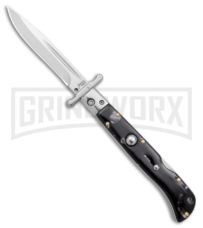 This knife has a marbled black Pearlex handle and a drop point blade.