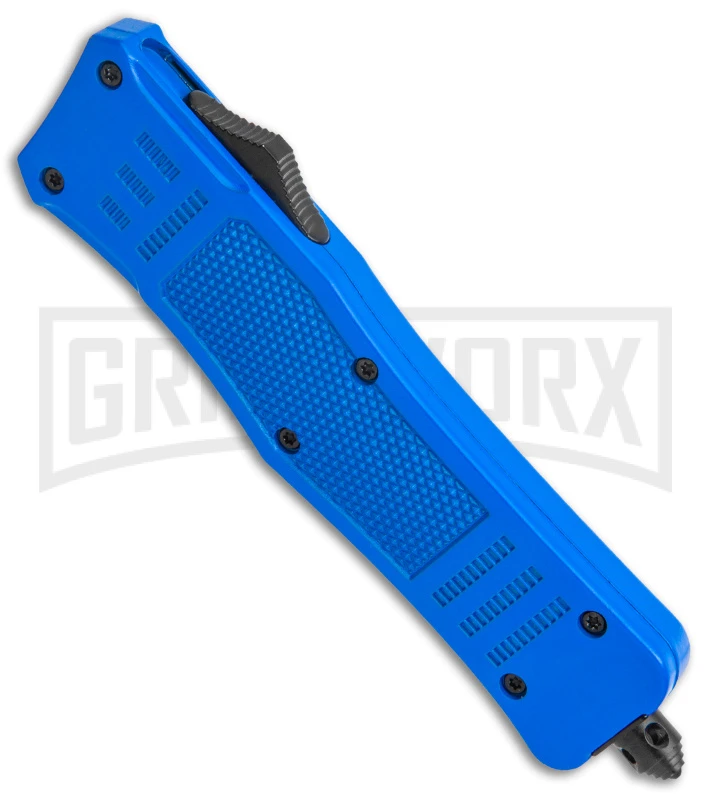 This Atomic OTF model has a medium sized blue handle and a two-tone finished dagger blade with plain edges.